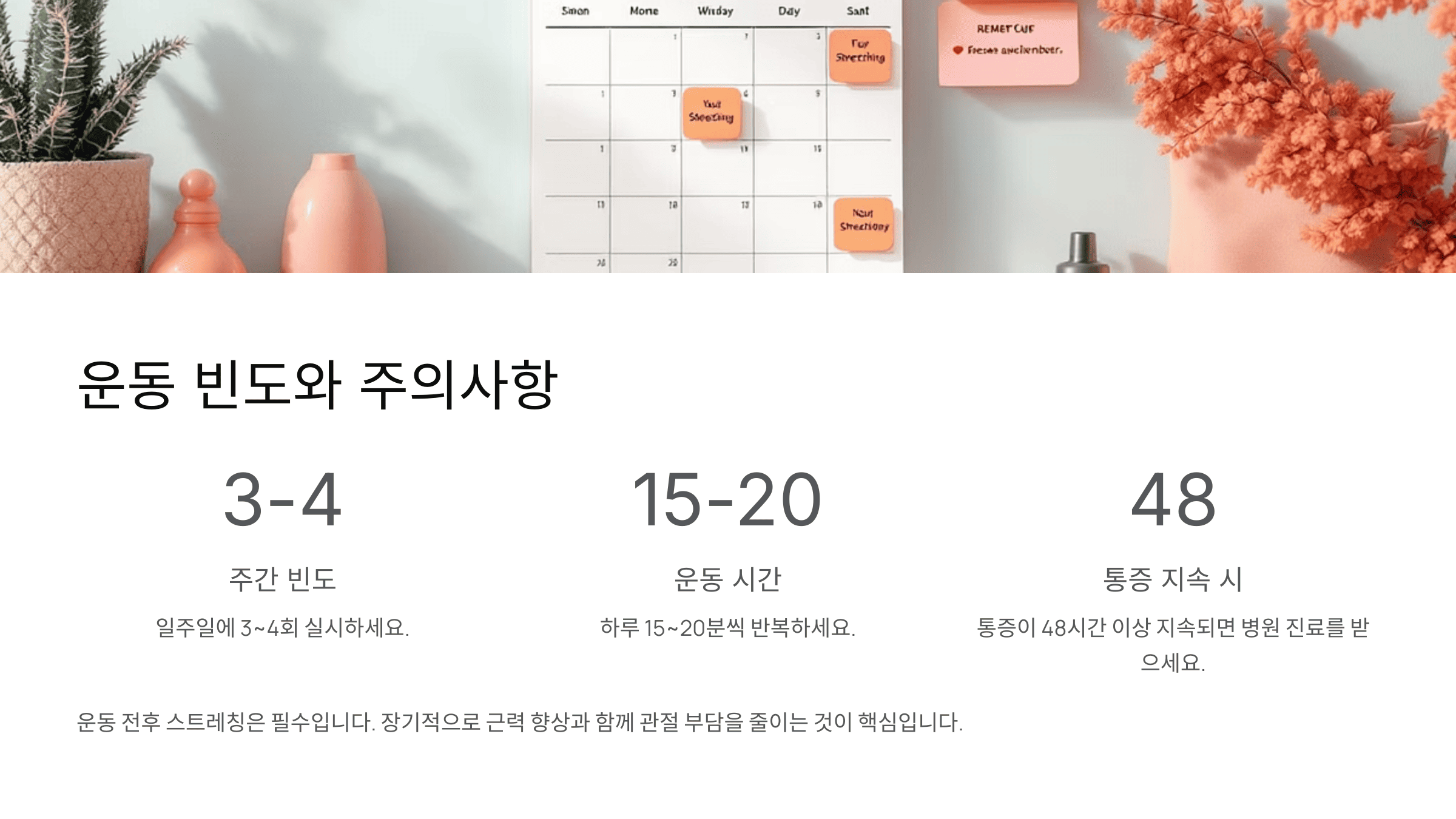 - 스트레칭으로 관절 가동 범위를 부드럽게 확장