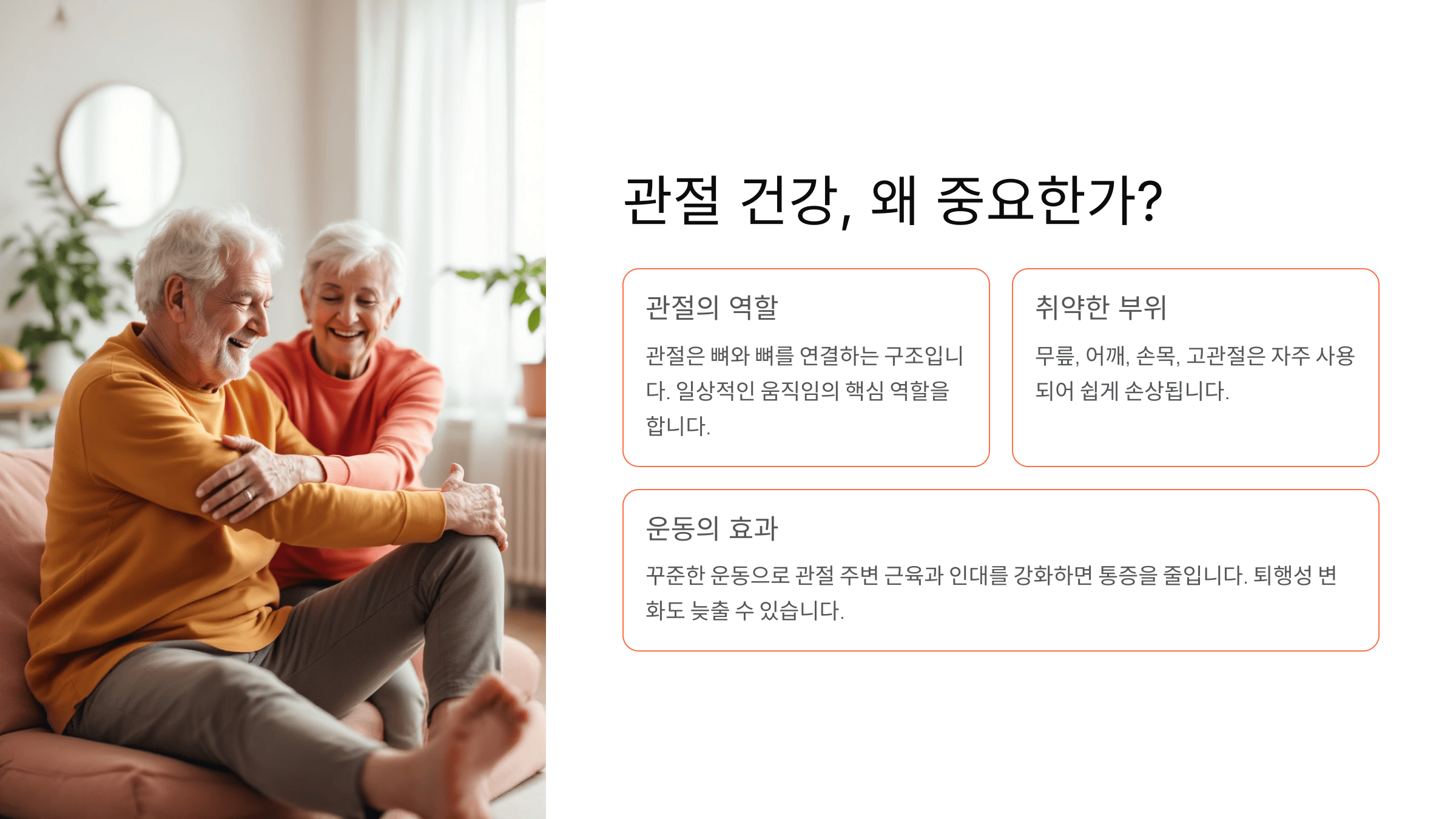 관절은 일상 속 움직임의 핵심입니다. 하지만 나이가 들수록 관절 통증과 불편함이 잦아지며, 일상생활의 질이 떨어질 수 있습니다. 특히 무릎, 어깨, 허리는 반복적인 사용으로 인해 쉽게 손상