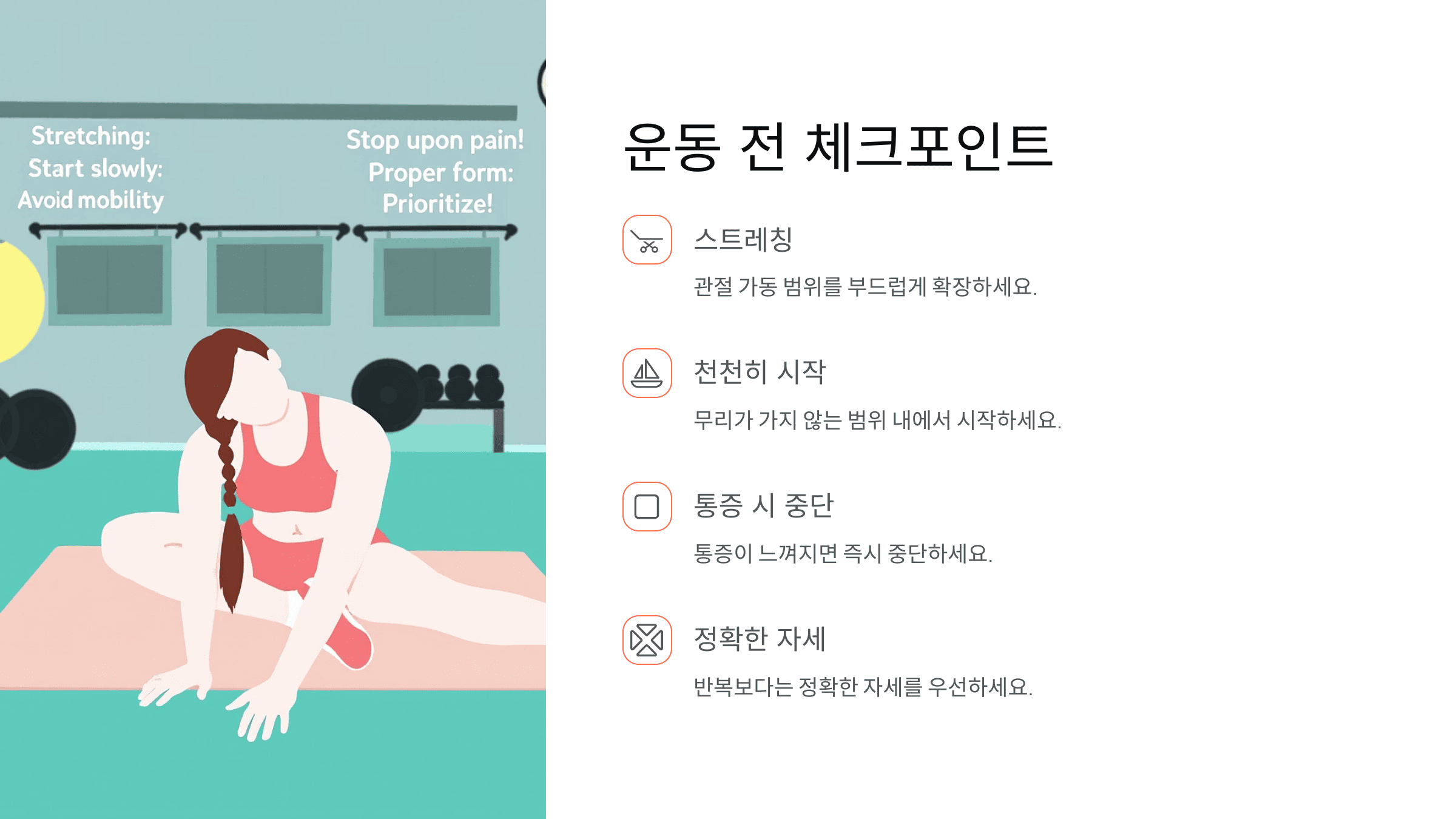 - 운동 전후 스트레칭 필수