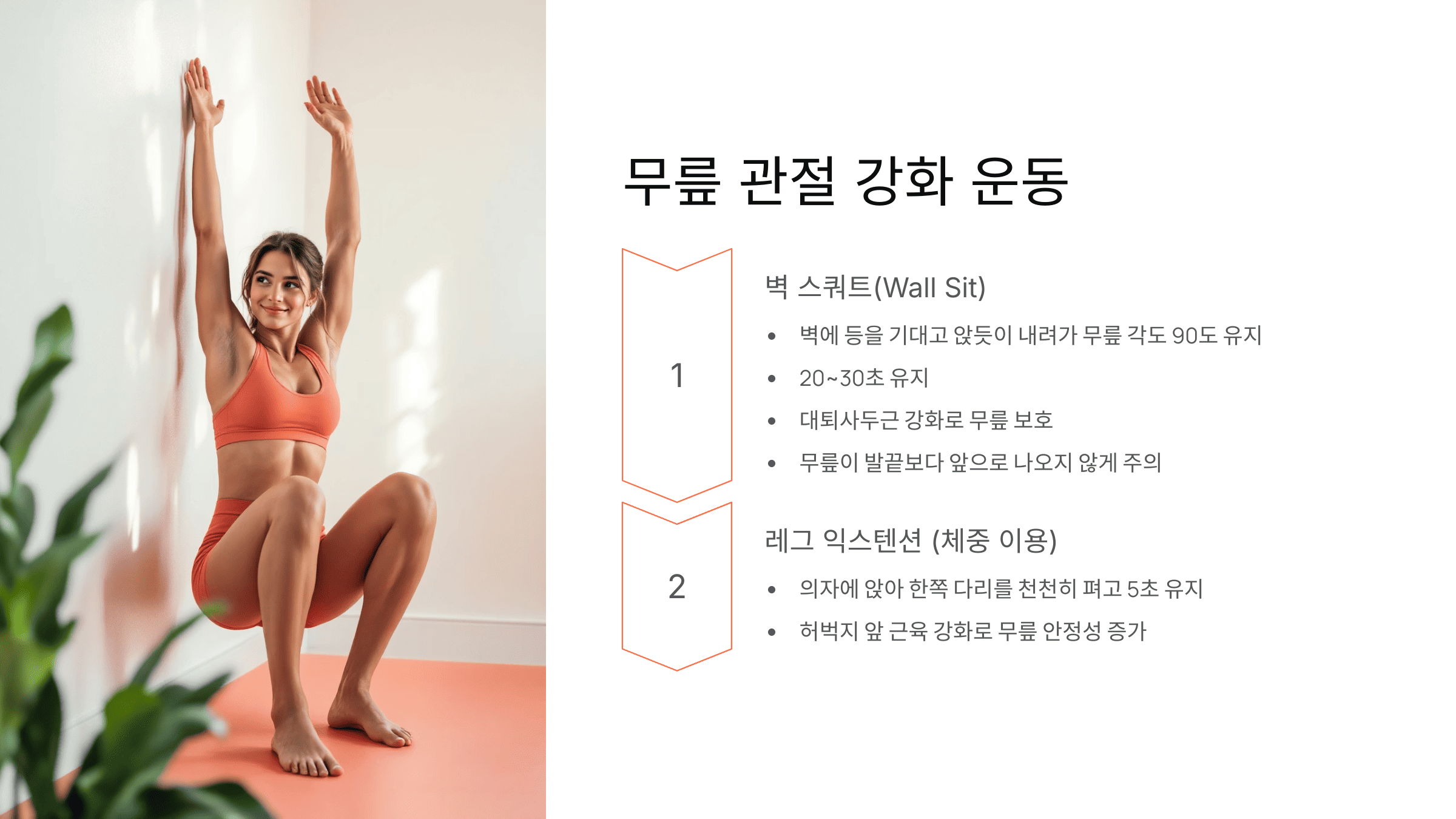 ● 방법: 벽에 등을 기대고 앉듯이 내려가 무릎 각도 90도 유지 (20~30초 유지)