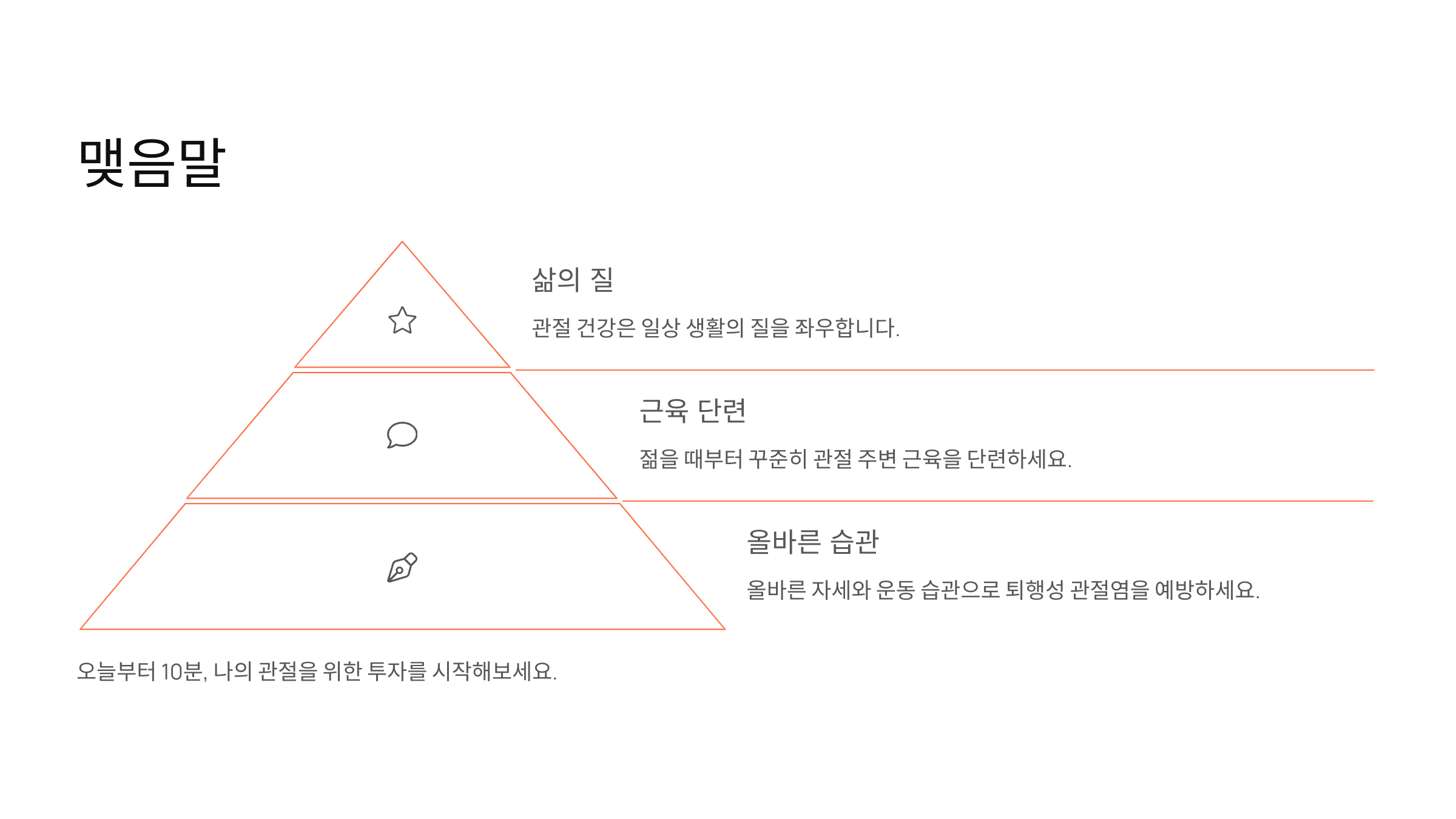 관절 건강은 일상 생활의 질을 좌우합니다. 젊을 때부터 꾸준히 관절 주변 근육을 단련하고, 올바른 자세와 운동 습관을 기르면 노화로 인한 통증과 퇴행성 관절염도 예방할 수 있습니다. 오늘부터 10분, 나의 관절을 위한 투자를 시작해보세요.
