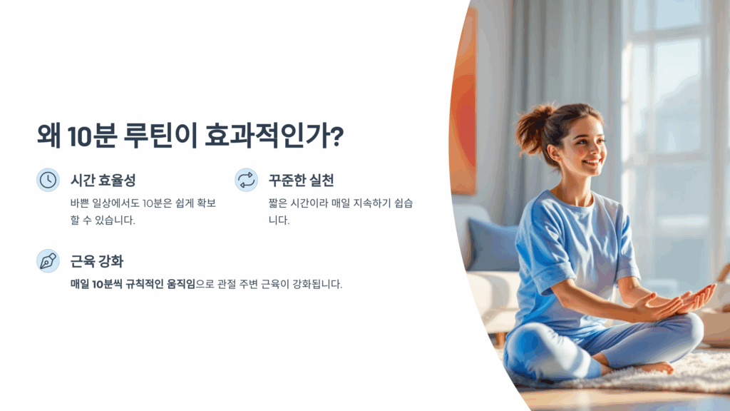 꾸준함이 관절 건강 유지의 핵심입니다. 1시간 이상 무리하게 운동하는 것보다, 매일 10분씩 규칙적인 움직임을 통해 관절 주변의 근육을 강화하고 유연성을 기르면 장기적으로 통증 예방에 효과적입니다.