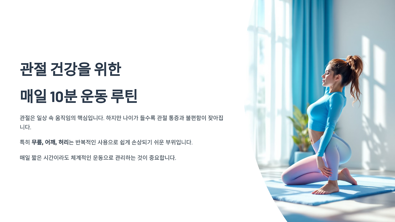 아래는 무릎, 어깨, 허리 관절을 중심으로 구성된 현실적이고 따라 하기 쉬운 루틴입니다. 매일 순서대로 진행하면 약 10분 내외로 완료할 수 있습니다.