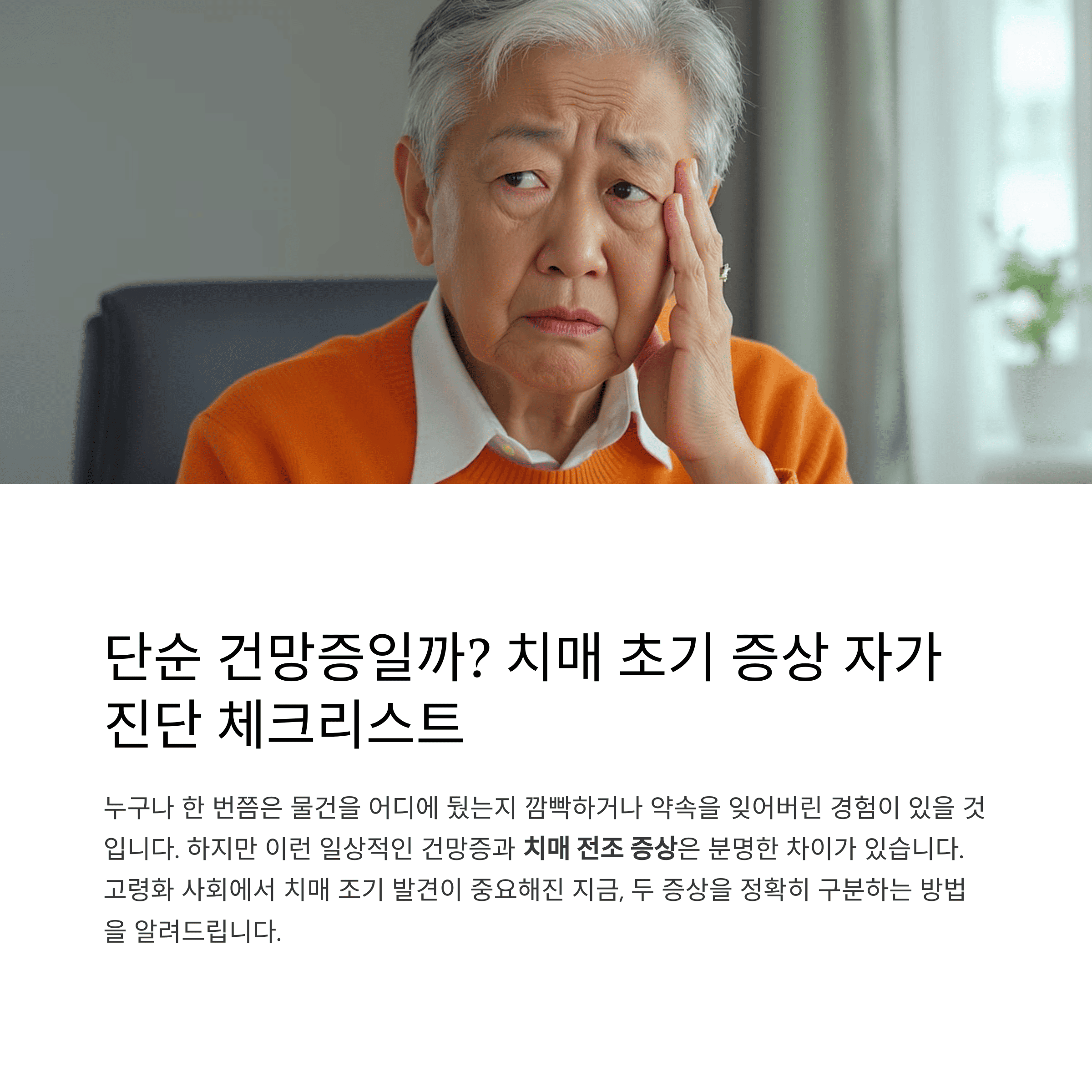 건망증은 누구에게나 찾아올 수 있는 자연스러운 현상이지만, 반복적이고 점점 심해진다면 반드시 전문가의 진단을 받아야 합니다. 가족의 관심과 예방이 치매를 막는 가장 큰 힘이 됩니다.