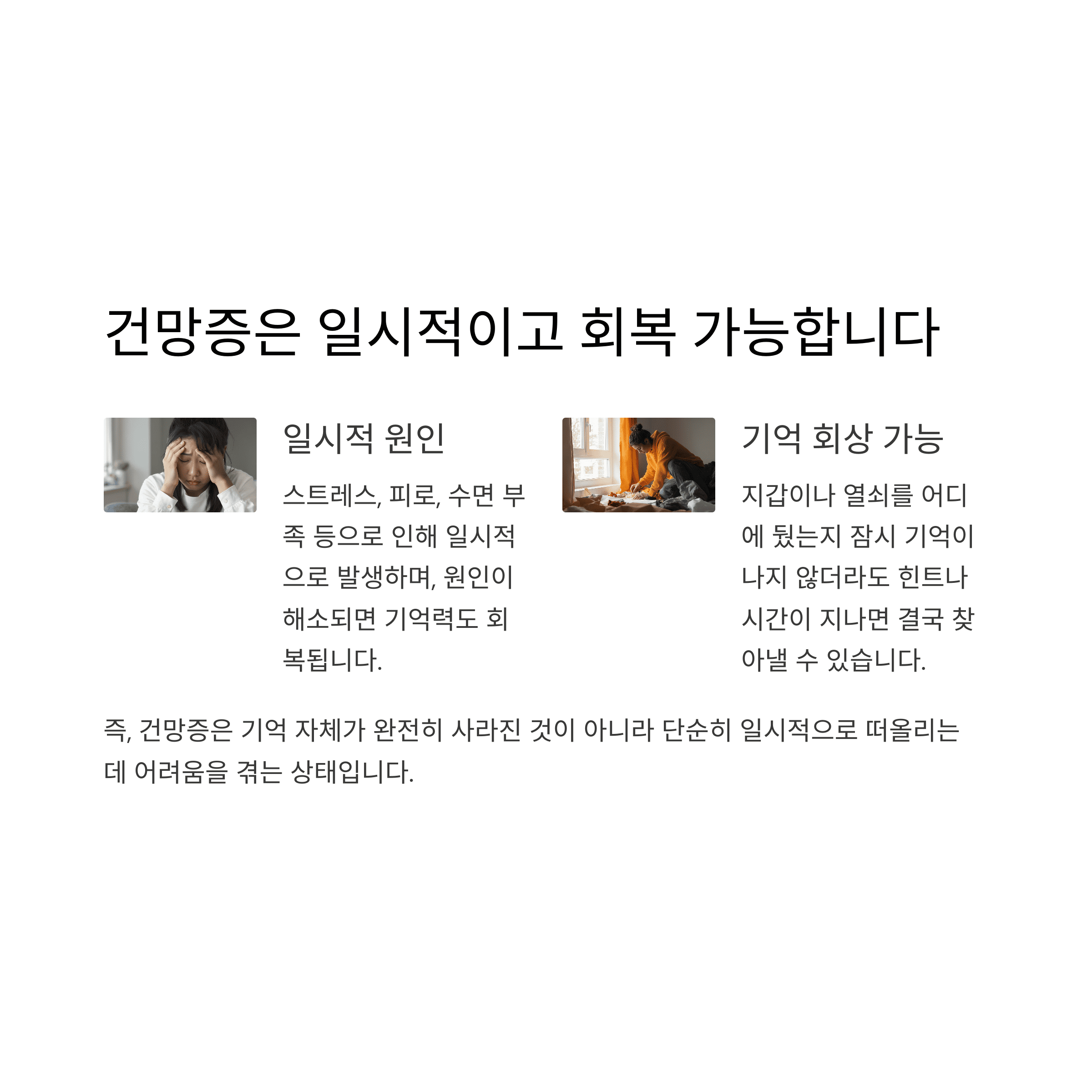 즉, 건망증은 기억 자체가 사라진 것이 아니라 단순히 떠올리는 데 시간이 걸리는 경우가 많습니다.