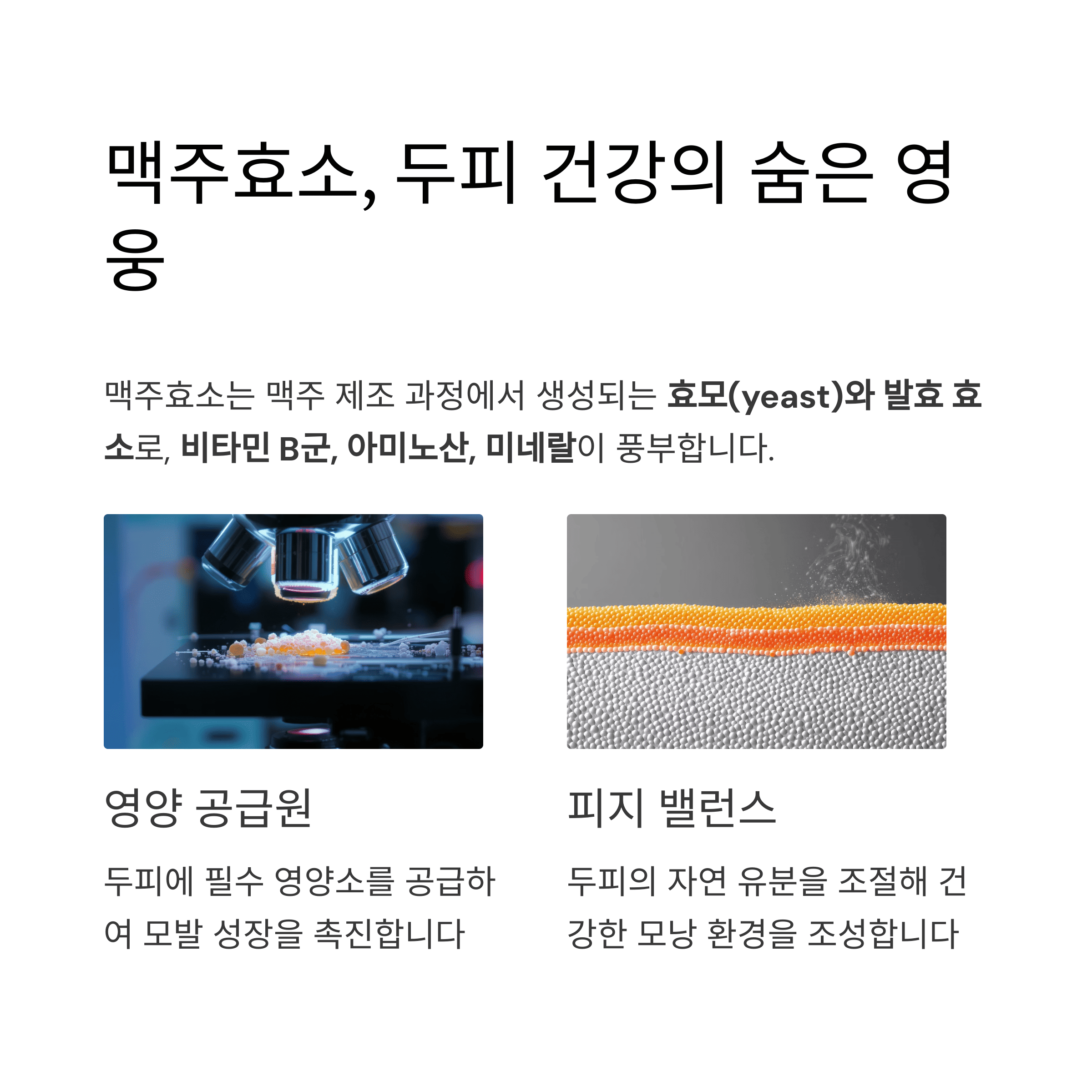 맥주효소에 포함된 비오틴과 B군 비타민은 모근을 강화시키고 탈모를 줄이는 데 도움이 됩니다. 특히 자가면역성 탈모나 지루성 두피염을 겪는 이들에게 두피 자극을 줄이는 효과가 보고되고 있습니다. - 두피 진정 및 각질 제거