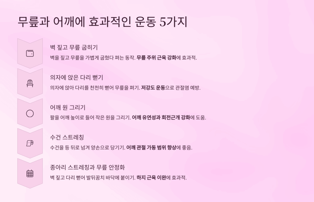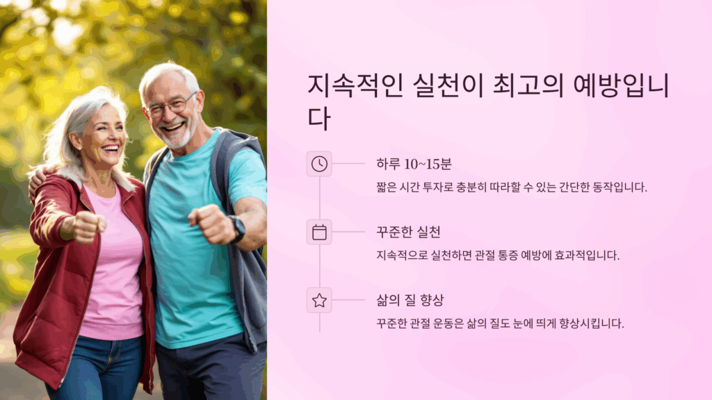 위에서 소개한 5가지 운동은 하루 10~15분 투자로 충분히 따라할 수 있는 간단한 동작입니다. 중요한 것은 꾸준한 실천이며, 하루에 짧은 시간이라도 지속적으로 실천하면 관절 통증 예방뿐만 아니라 삶의 질도 눈에 띄게 향상됩니다.※ 본 콘텐츠는 2025년 건강 기준 정보를 바탕으로 작성되었습니다.