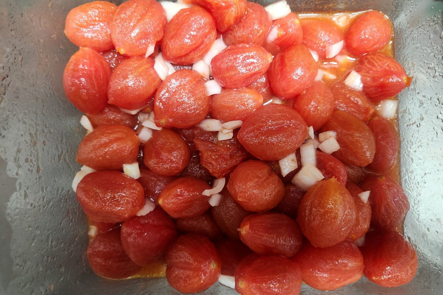 - 소스 준비: 손질한 토마토와 양파를 보관통에 담고 올리브오일 7큰술, 알룰로스 3스푼, 레몬즙 6~7큰술을 넣고 잘 소금, 후추를 넣고 잘 섞습니다.