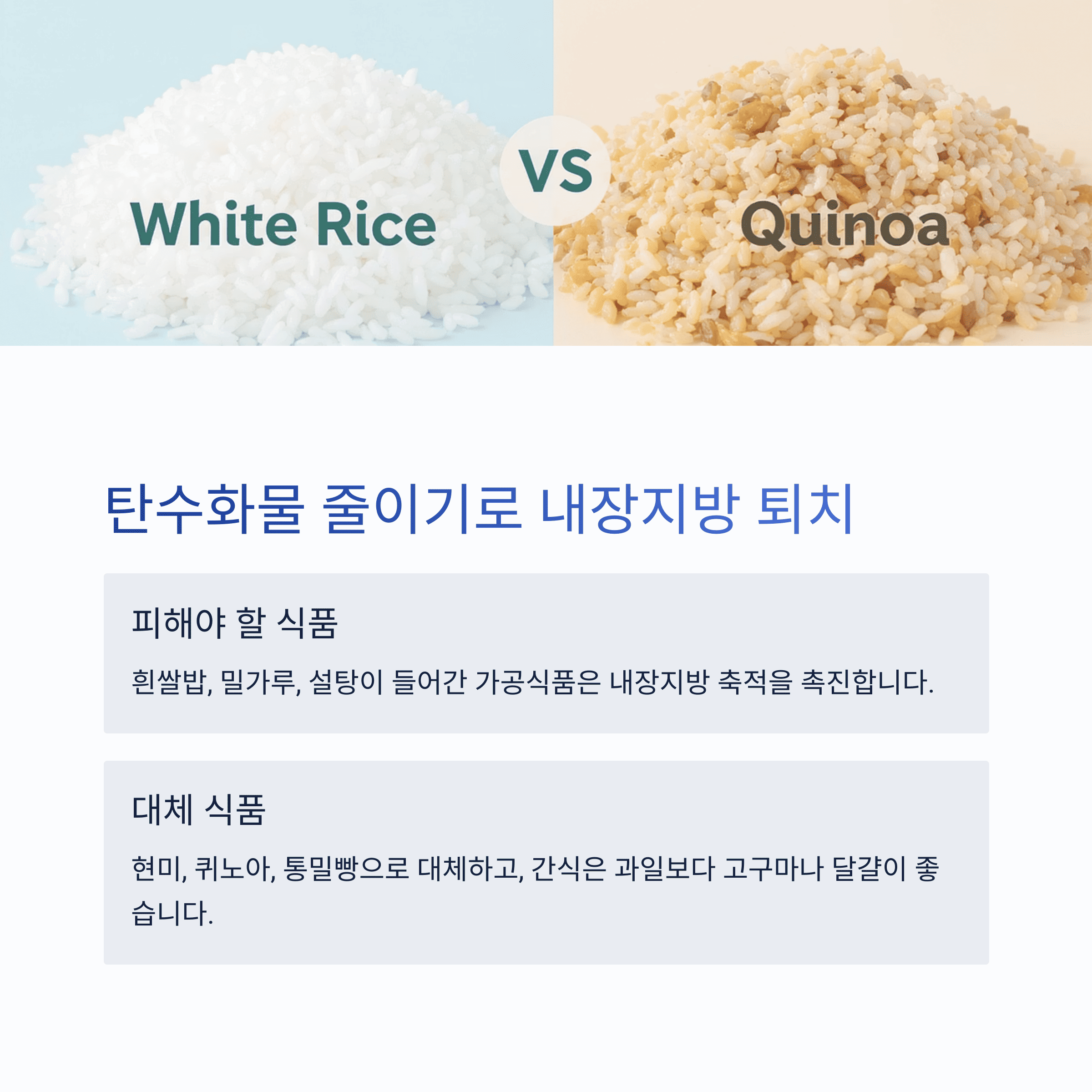 - 대체 식품: 현미, 퀴노아, 통밀빵