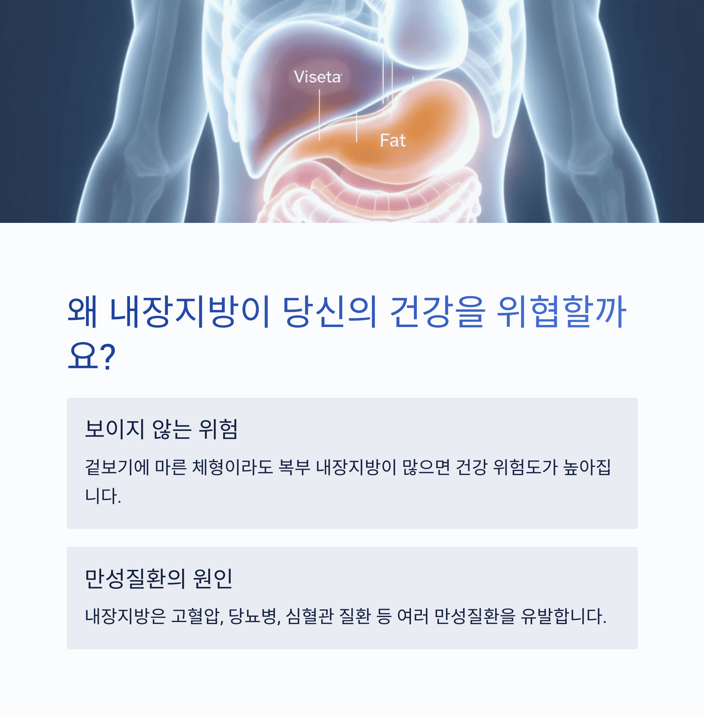 내장지방은 우리 몸속 장기 주변에 쌓이는 지방으로, 고혈압, 당뇨, 심혈관 질환 등 다양한 만성질환의 원인이 됩니다.