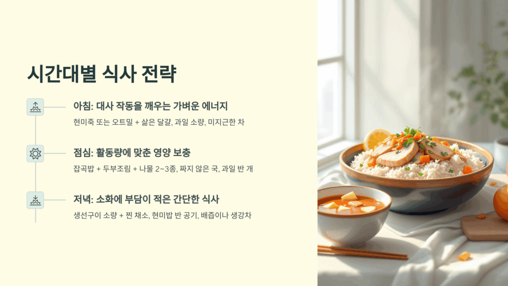 - 양질의 단백질 보충 – 근육 유지를 위해 생선, 두부, 닭가슴살, 달걀 섭취