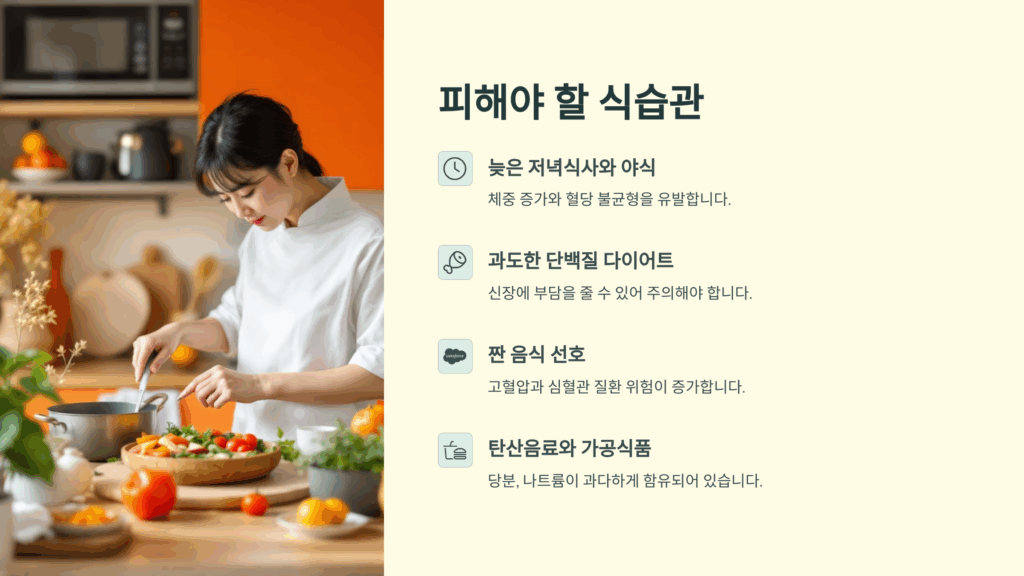 - 늦은 저녁식사와 야식 – 체중 증가와 혈당 불균형 유발