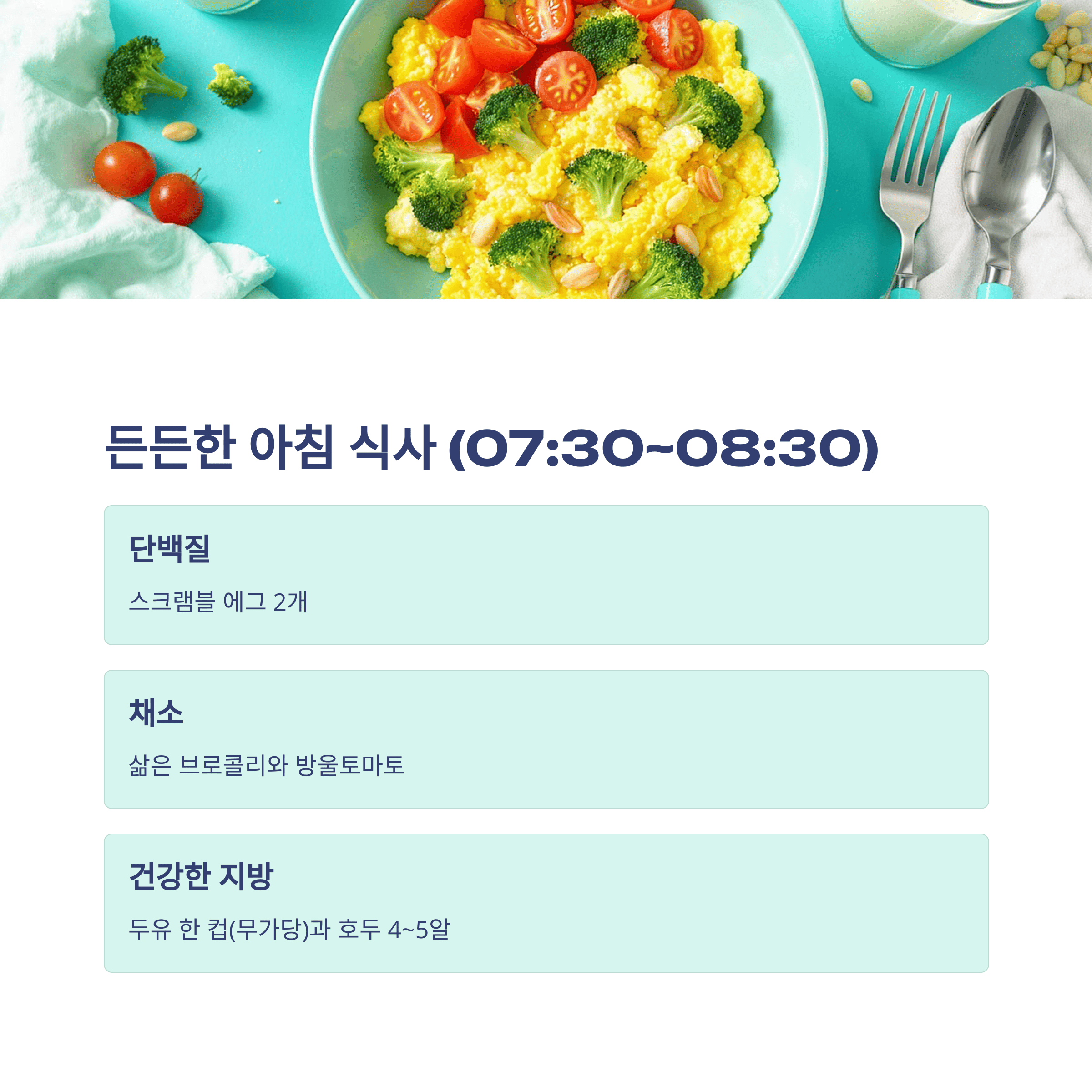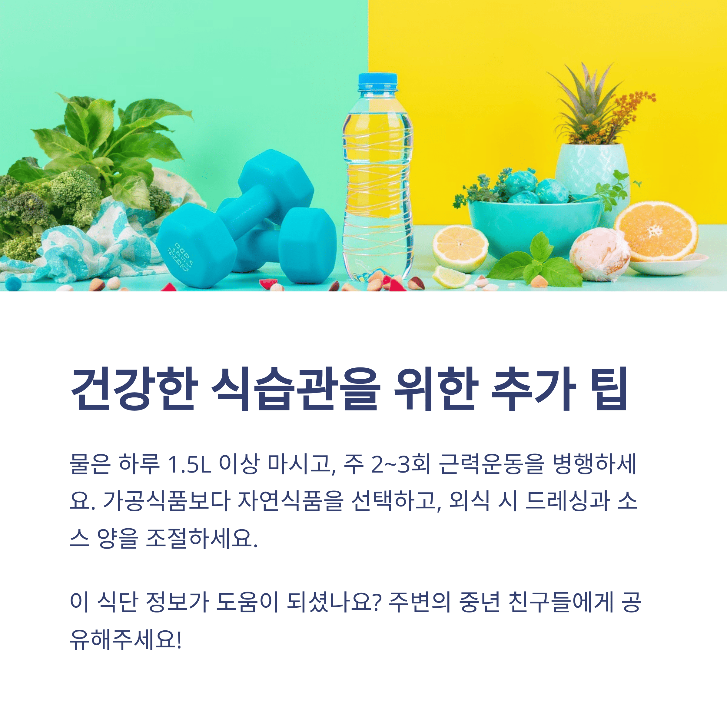 이번 글에서는 바쁜 일상 속에서도 쉽게 따라 할 수 있는 중년 맞춤형 하루 식단을 예시로 소개합니다.