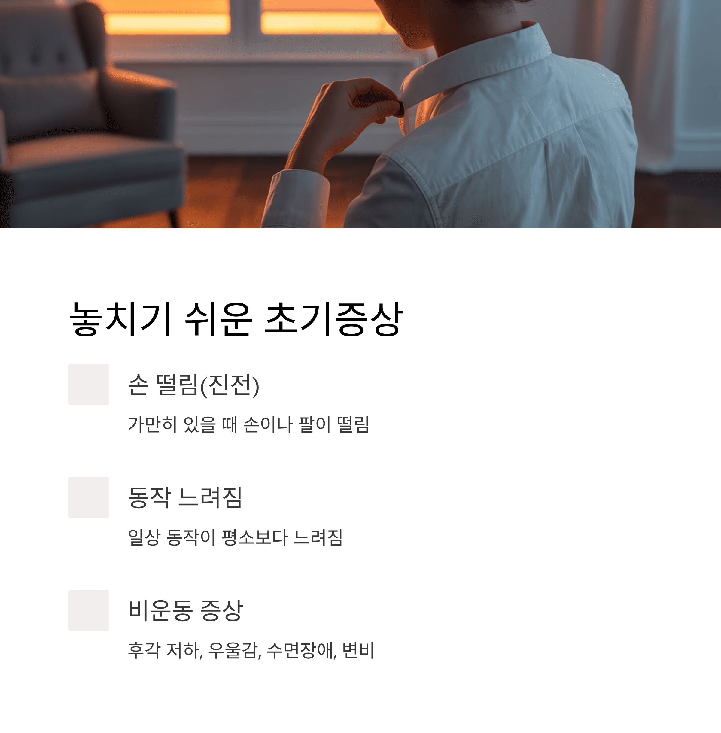 - 동작 느려짐(운동 완서) : 걷기, 옷 입기 등 일상 동작이 평소보다 느려집니다.