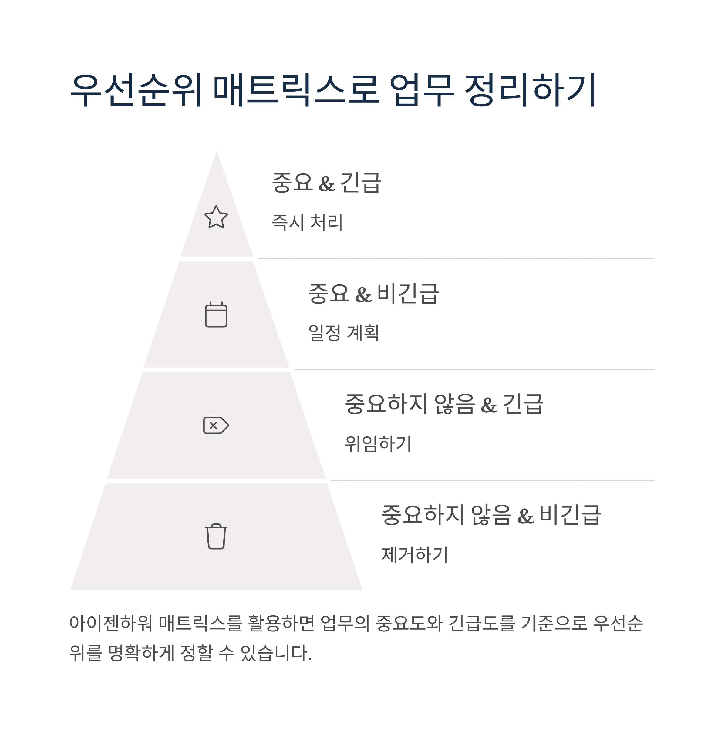 아이젠하워 매트릭스를 활용하면 업무의 중요도와 긴급도를 기준으로 해야 할 일의 우선순위를 명확하게 정할 수 있습니다.