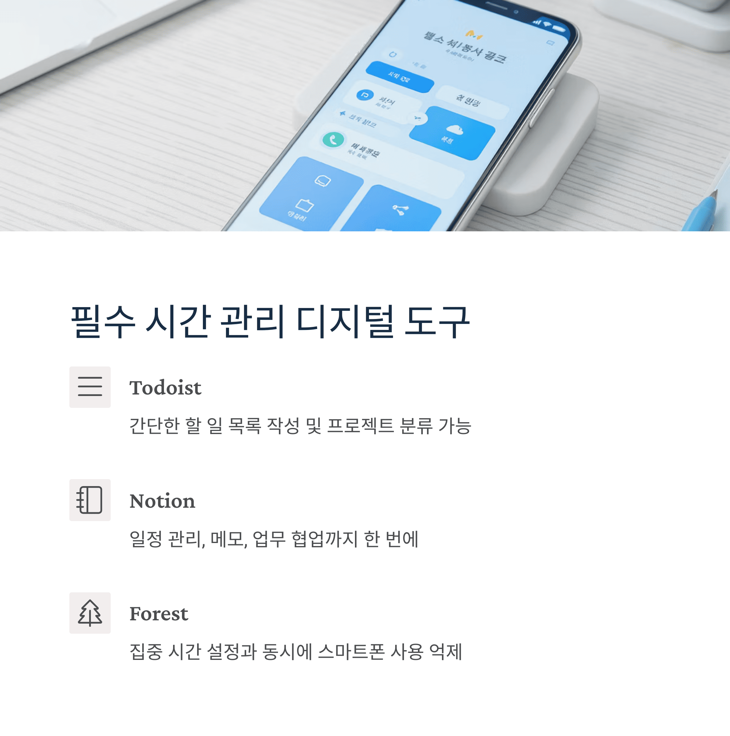 - Forest: 집중 시간 설정과 동시에 스마트폰 사용 억제