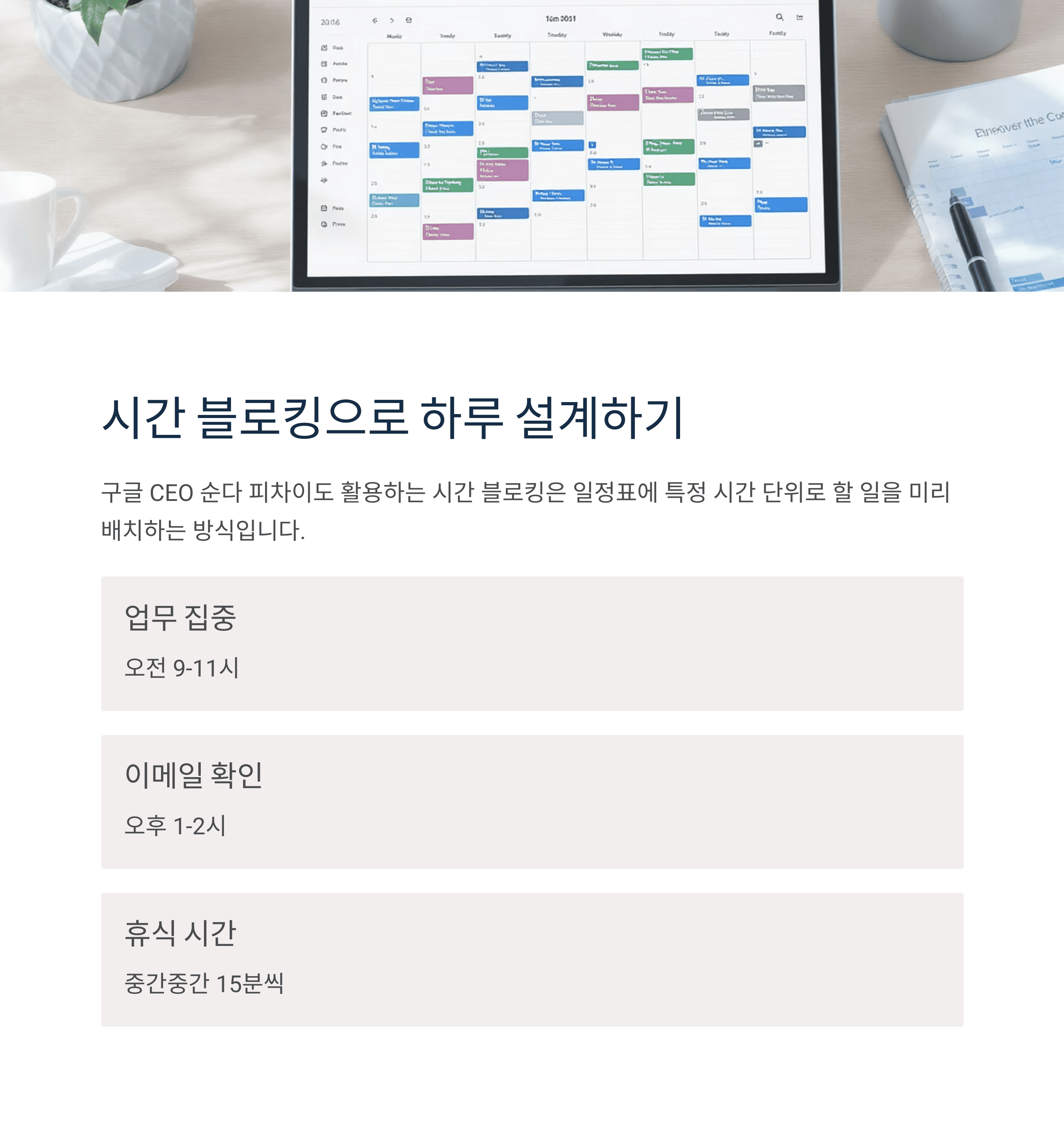 구글 CEO 순다 피차이도 활용하는 시간 블로킹은 일정표에 특정 시간 단위로 할 일을 미리 배치해두는 방식입니다.