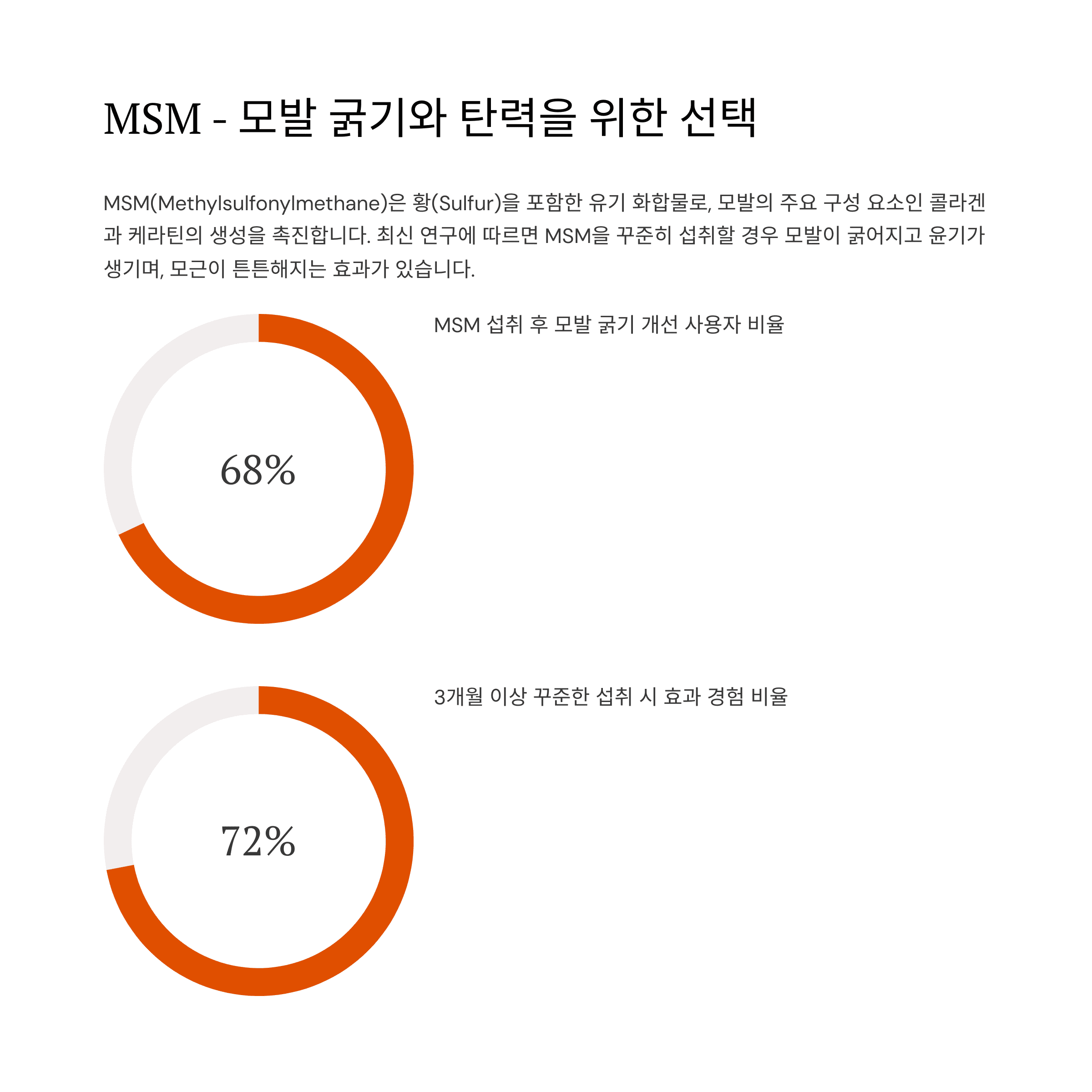 MSM은 황(Sulfur)을 포함한 유기 화합물로, 콜라겐과 케라틴의 생성을 돕습니다. 꾸준히 섭취하면 모발이 굵어지고 윤기가 생기며, 모근이 튼튼해진다는 연구도 보고되었습니다.