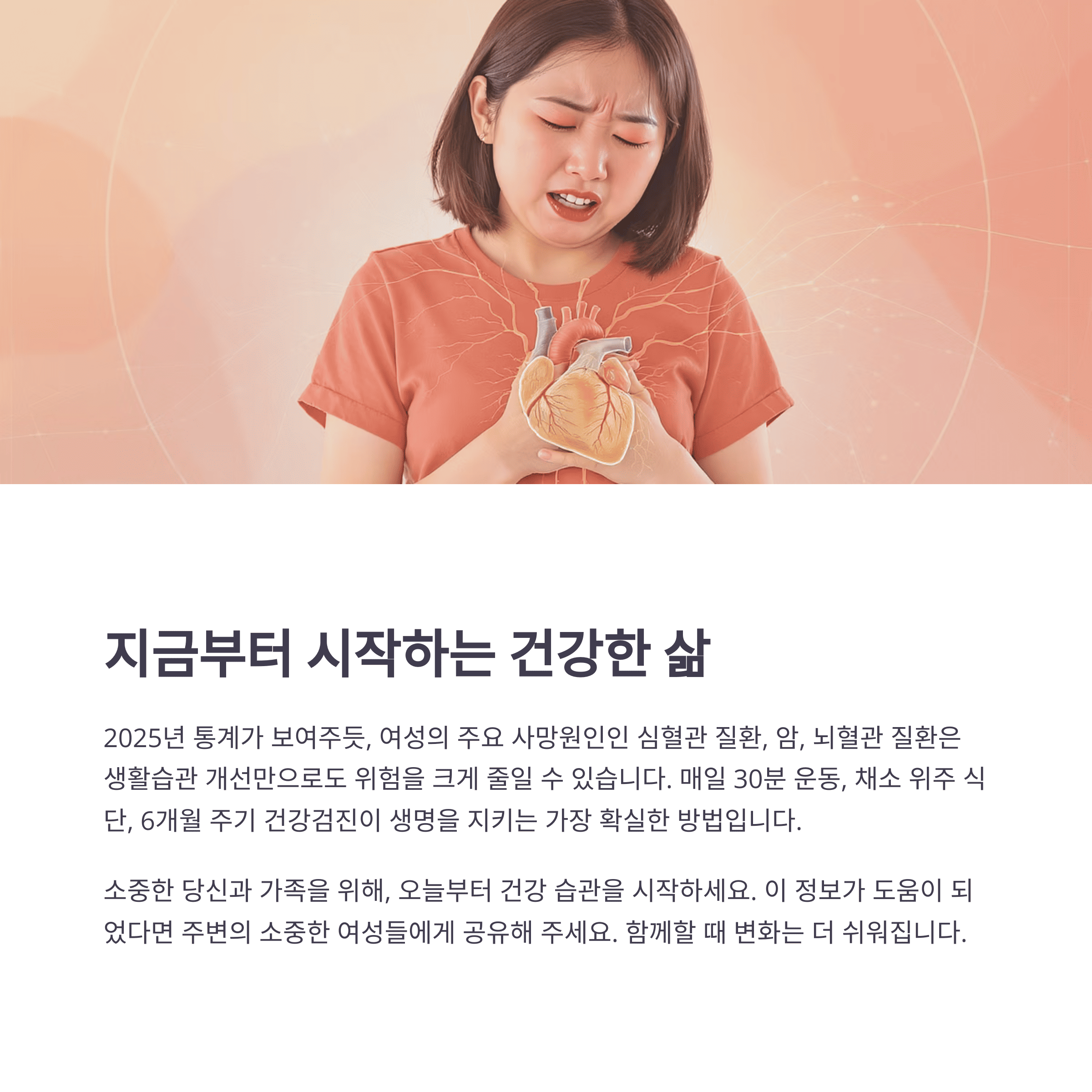 2025년 현재, 여성의 건강을 위협하는 사망원인은 조기 진단과 꾸준한 관리로 충분히 예방하거나 진행을 늦출 수 있습니다. 특히 심혈관 질환, 암, 뇌혈관 질환은 생활습관 개선이 핵심입니다. 정기적인 건강검진과 더불어, 평소의 건강한 습관이 여성의 생명을 지키는 최선의 방법입니다.