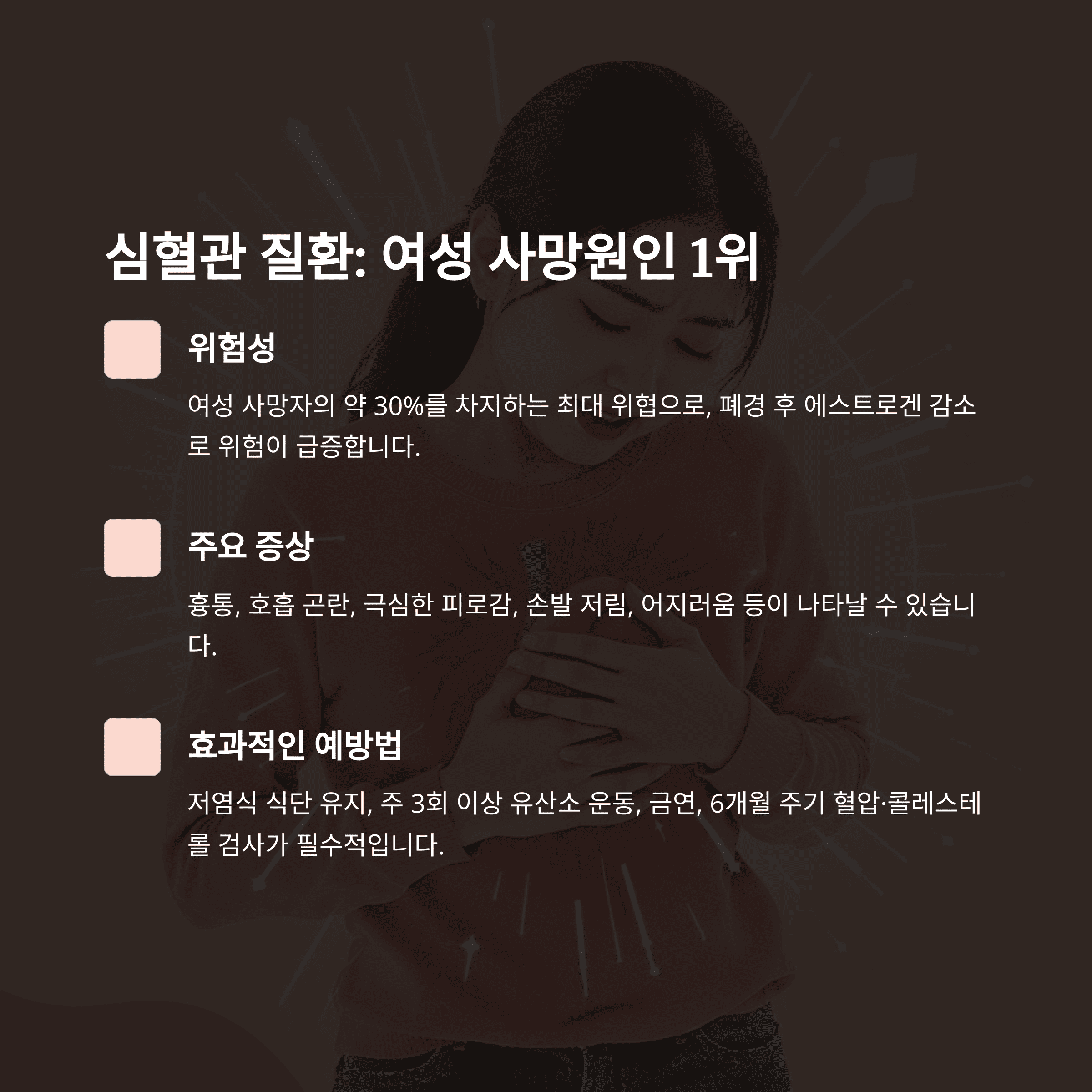 심혈관 질환은 여성 사망원인 1위를 차지하고 있으며, 전체 여성 사망자의 약 30%를 차지합니다. 심장마비, 협심증, 고혈압성 심부전 등이 대표적인 질환입니다. 특히 폐경 이후 에스트로겐 분비 감소로 인해 심혈관 위험이 증가합니다.