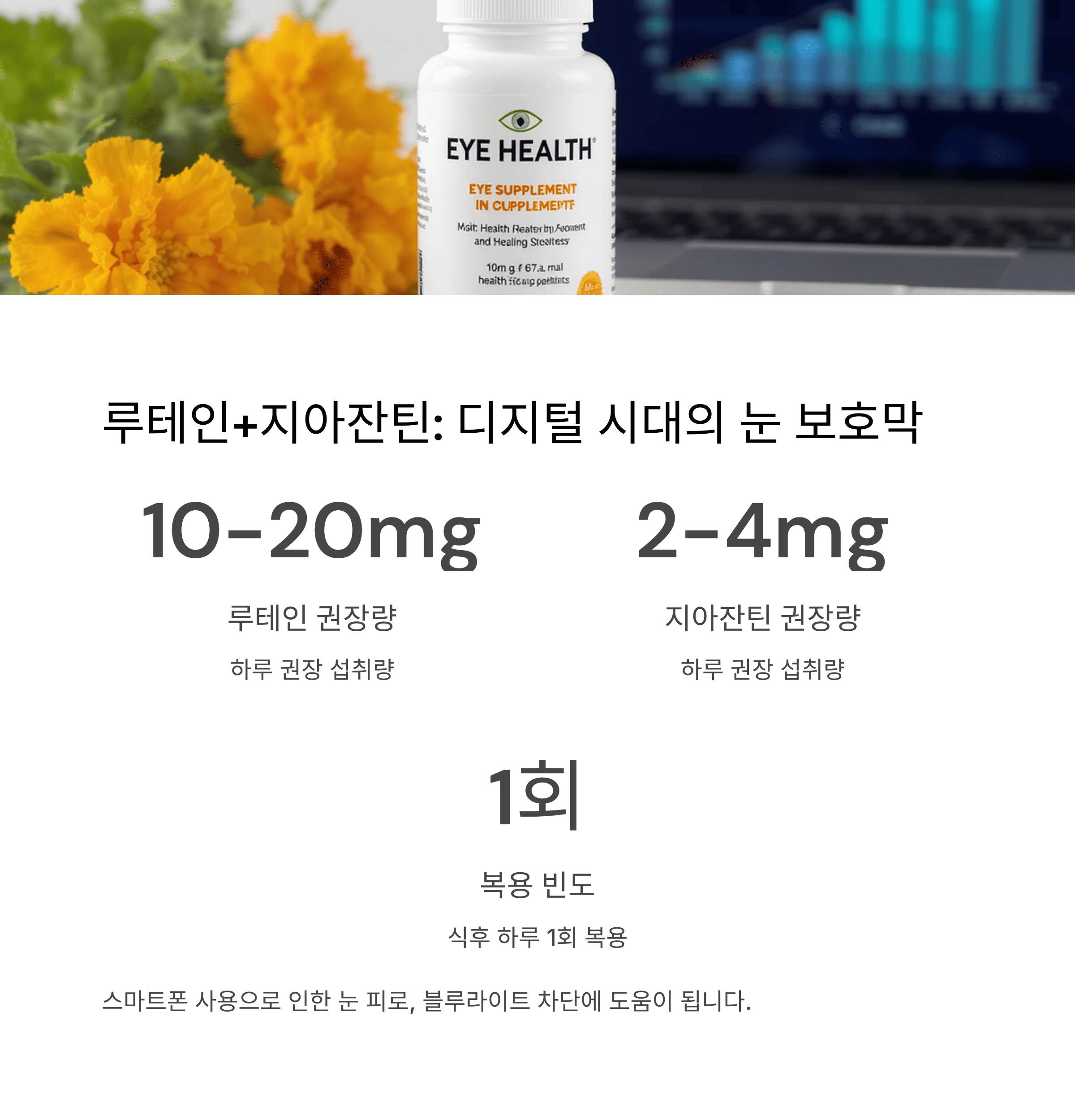 • 권장 용량: 루테인 10~20mg + 지아잔틴 2~4mg