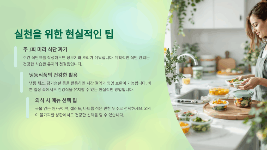 • 냉동식품의 건강한 활용: 냉동 채소, 닭가슴살 등을 활용하면 시간 절약과 영양 보완이 가능합니다.