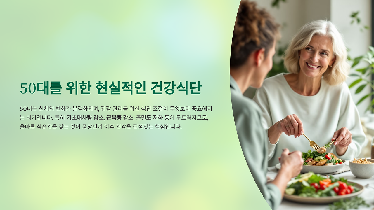 50대는 신체의 변화가 본격화되며, 건강 관리를 위한 식단 조절이 무엇보다 중요해지는 시기입니다. 특히 기초대사량 감소, 근육량 감소, 골밀도 저하 등이 두드러지므로, 올바른 식습관을 갖는 것이 중장년기 이후 건강을 결정짓는 핵심입니다.