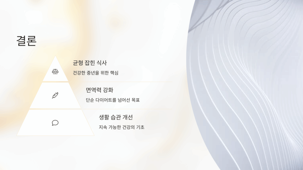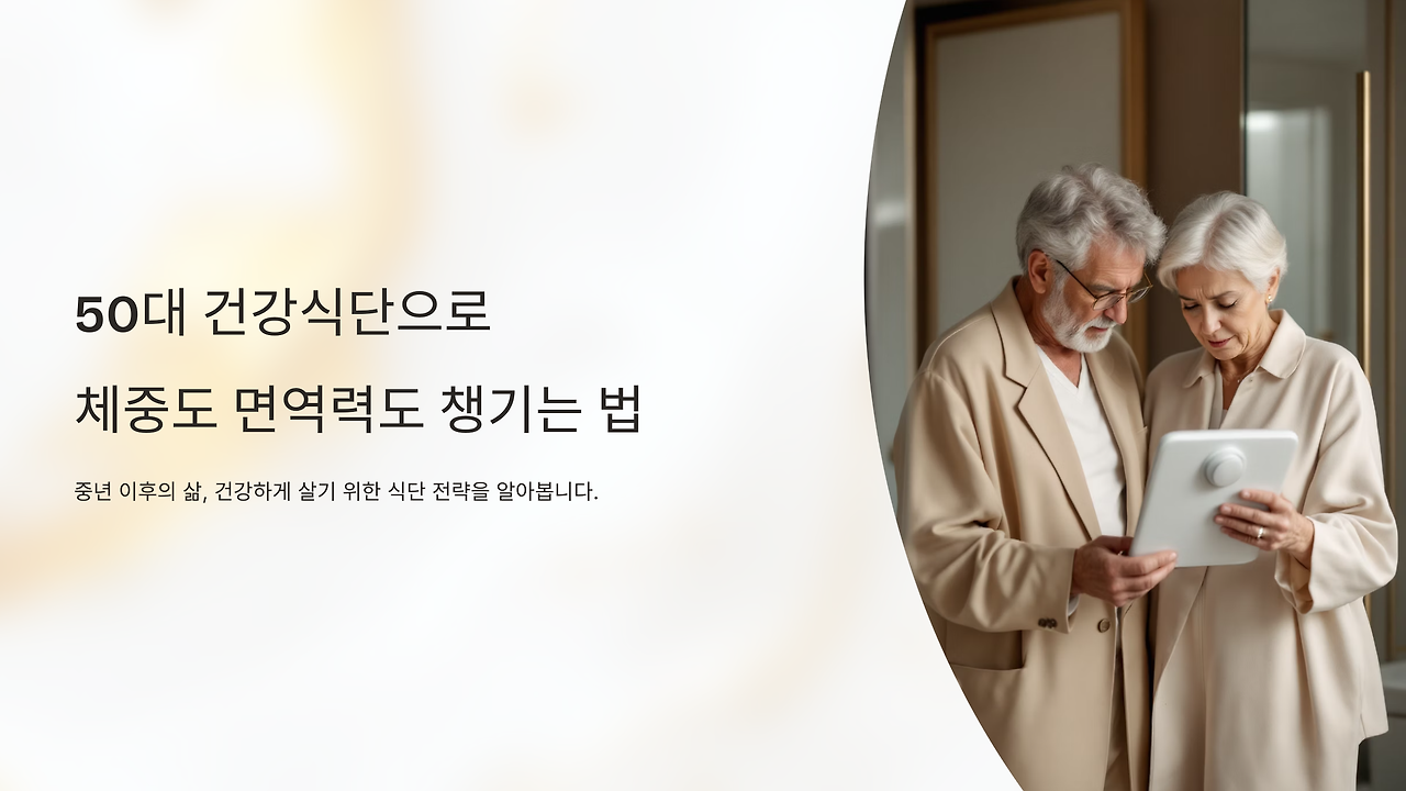 50대 이후에는 단순한 다이어트보다 면역력과 건강 전체를 고려한 식단이 중요합니다. 위의 가이드를 참고하여 균형 잡힌 식사로 건강한 중년을 준비하세요.