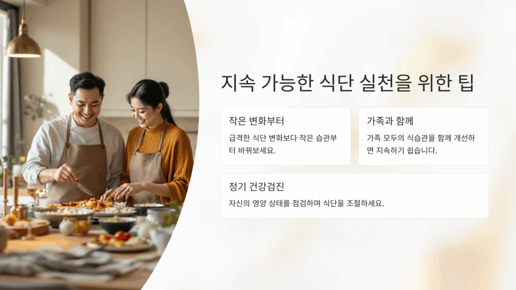 식단은 일시적으로 유지해서는 큰 효과를 보기 어렵습니다. 작은 변화부터 실천하고, 가족과 함께 식습관을 개선하는 것이 중요합니다. 또한 정기적인 건강검진과 함께 자신의 영양 상태를 점검하며 조절하는 것이 필요합니다.